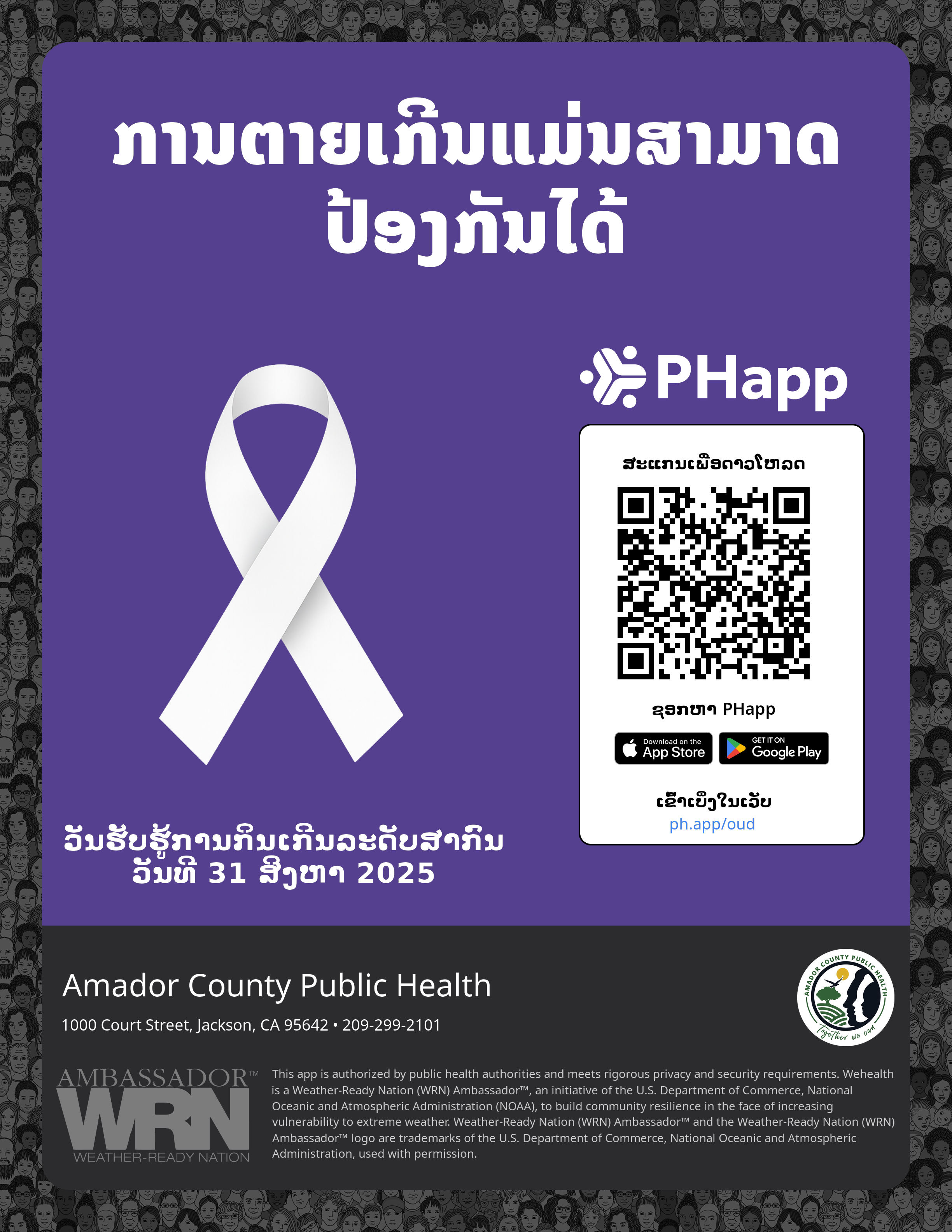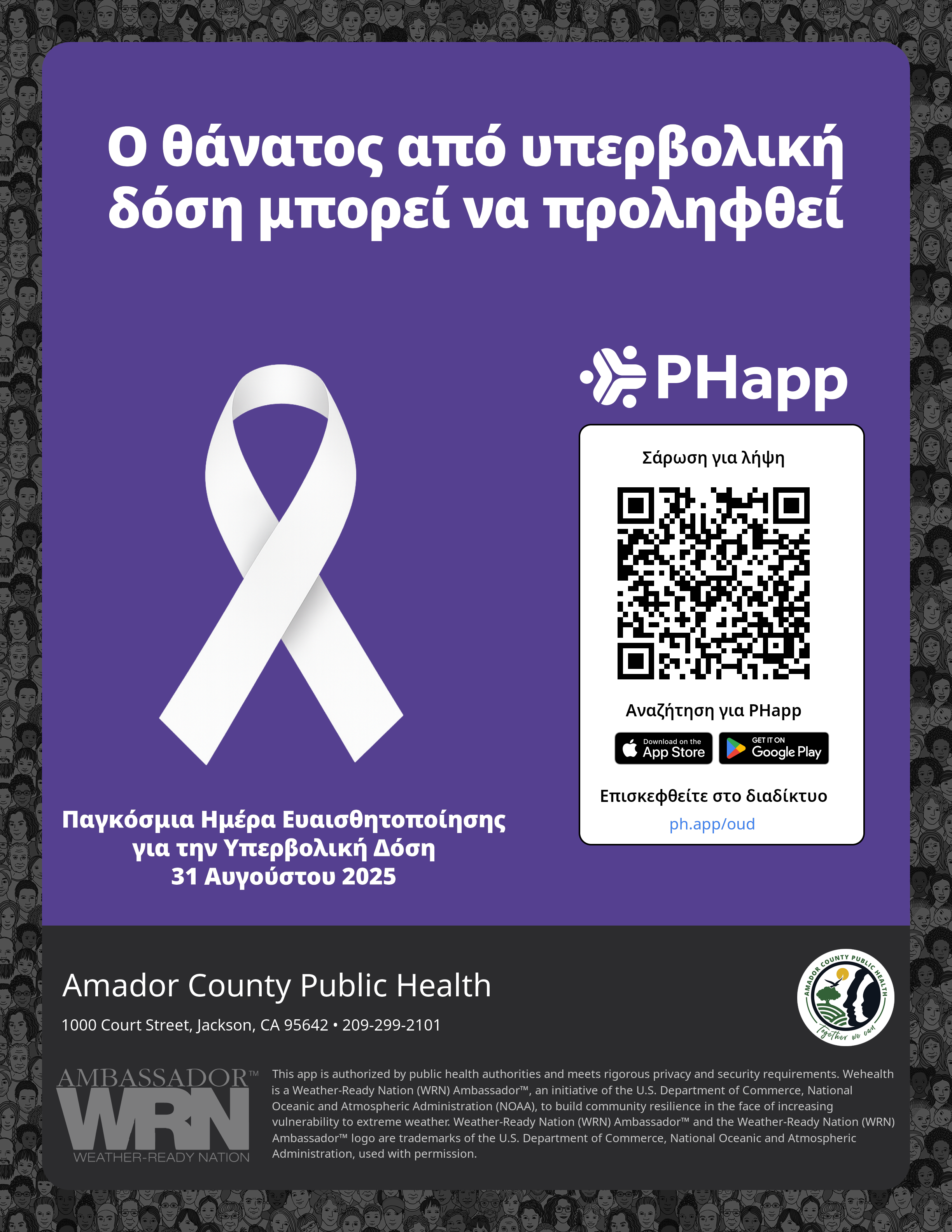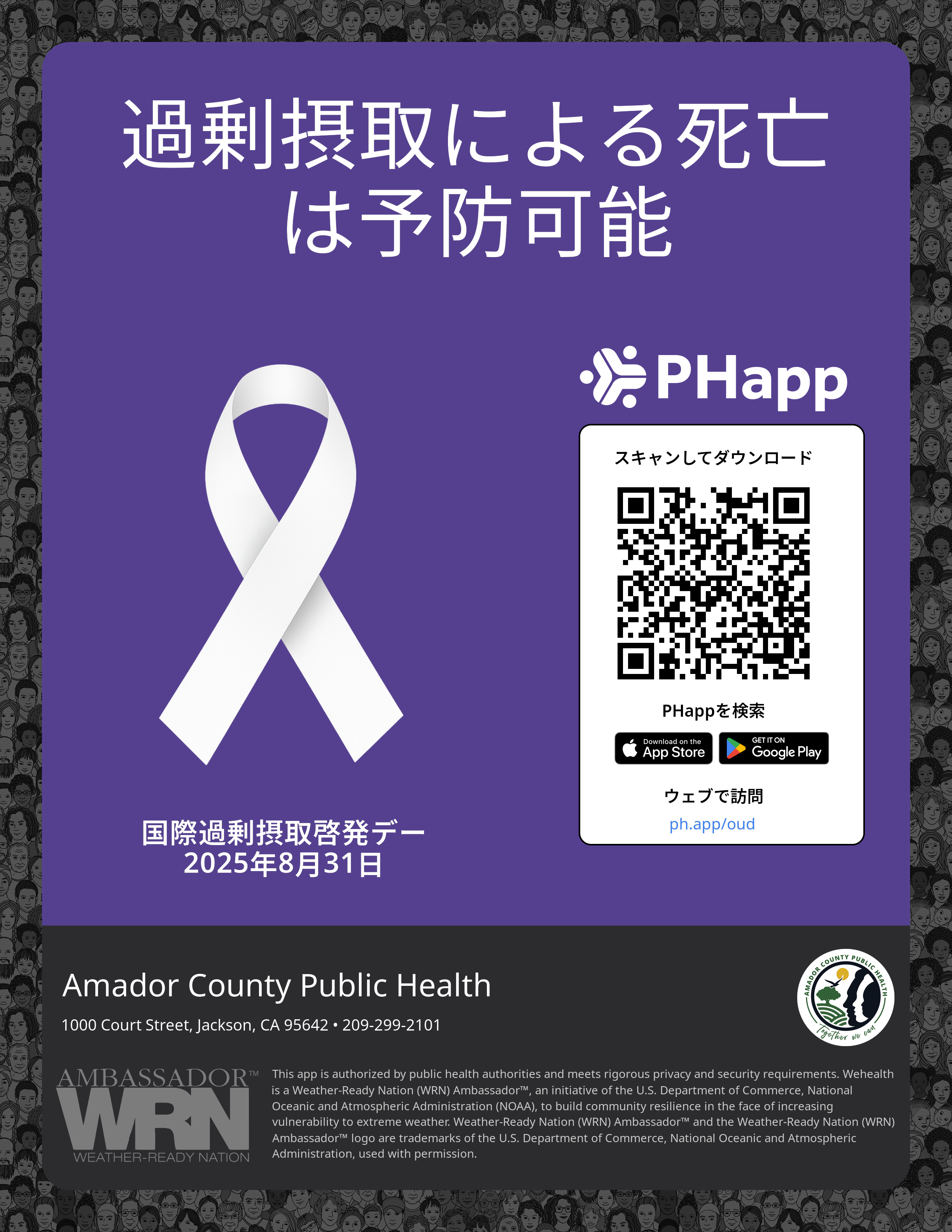 Print this flyer/poster on 8.5×11 paper. The QR code and links are personalized for Amador County Public Health.