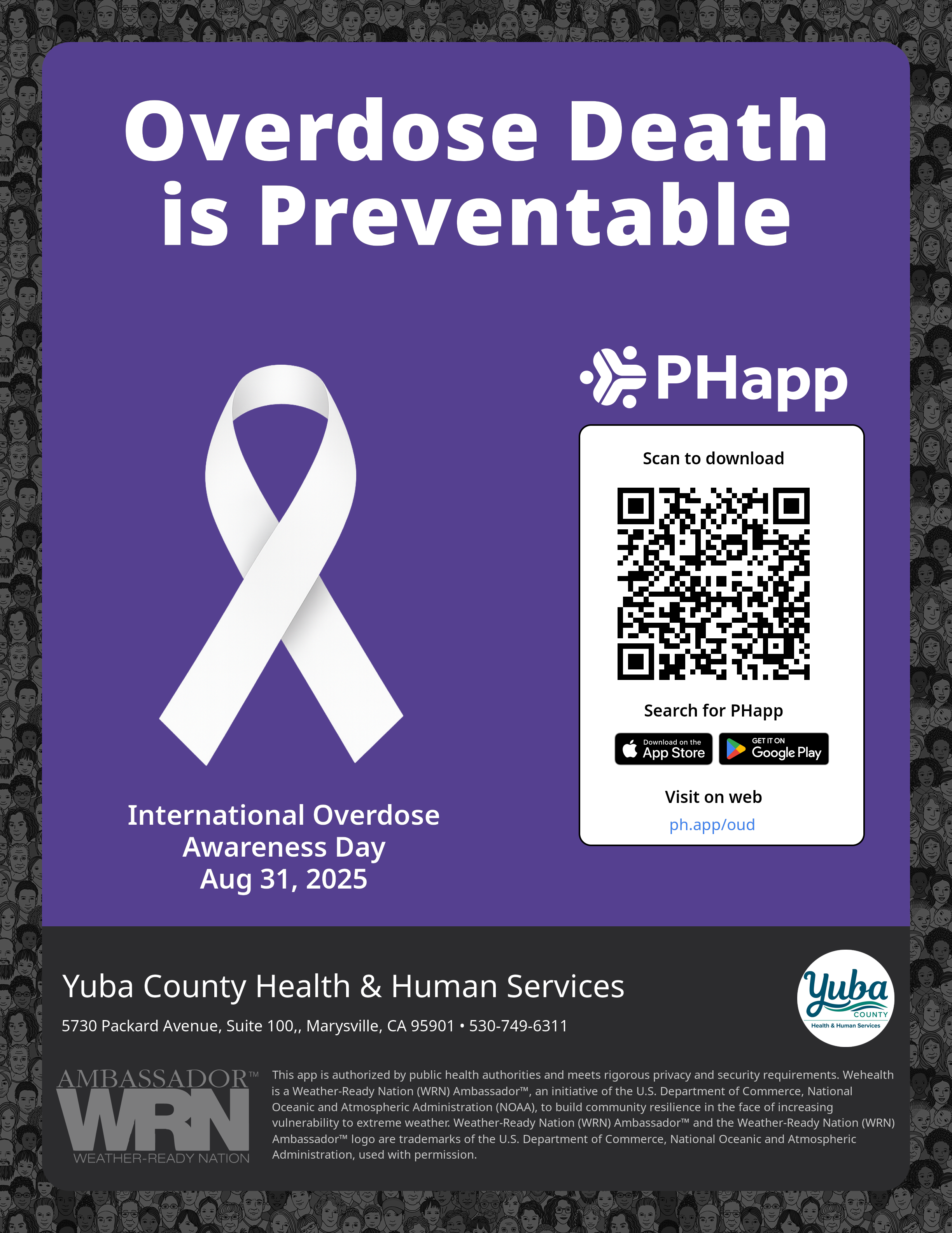 Print this flyer/poster on 8.5×11 paper. The QR code and links are personalized for Yuba County Health & Human Services.