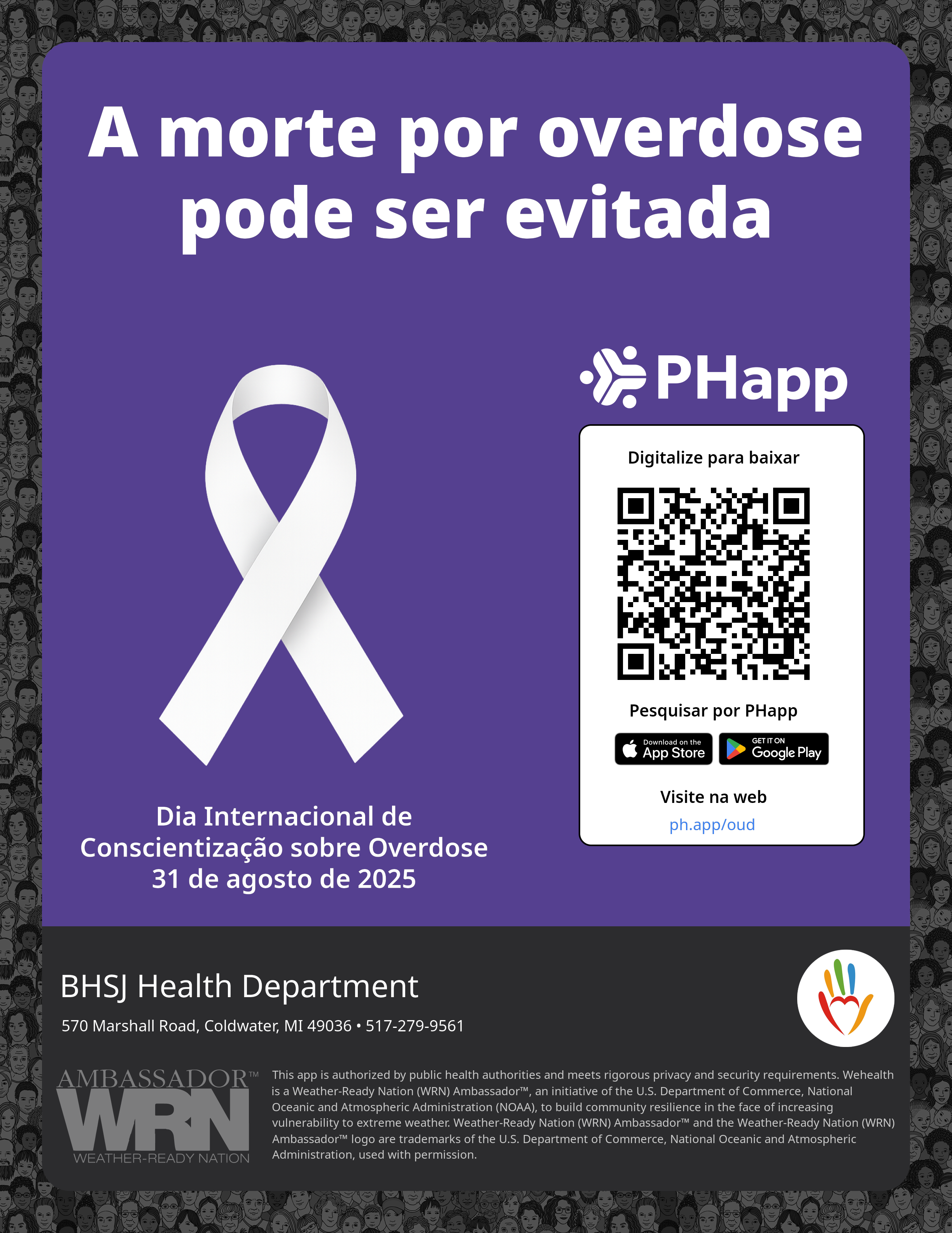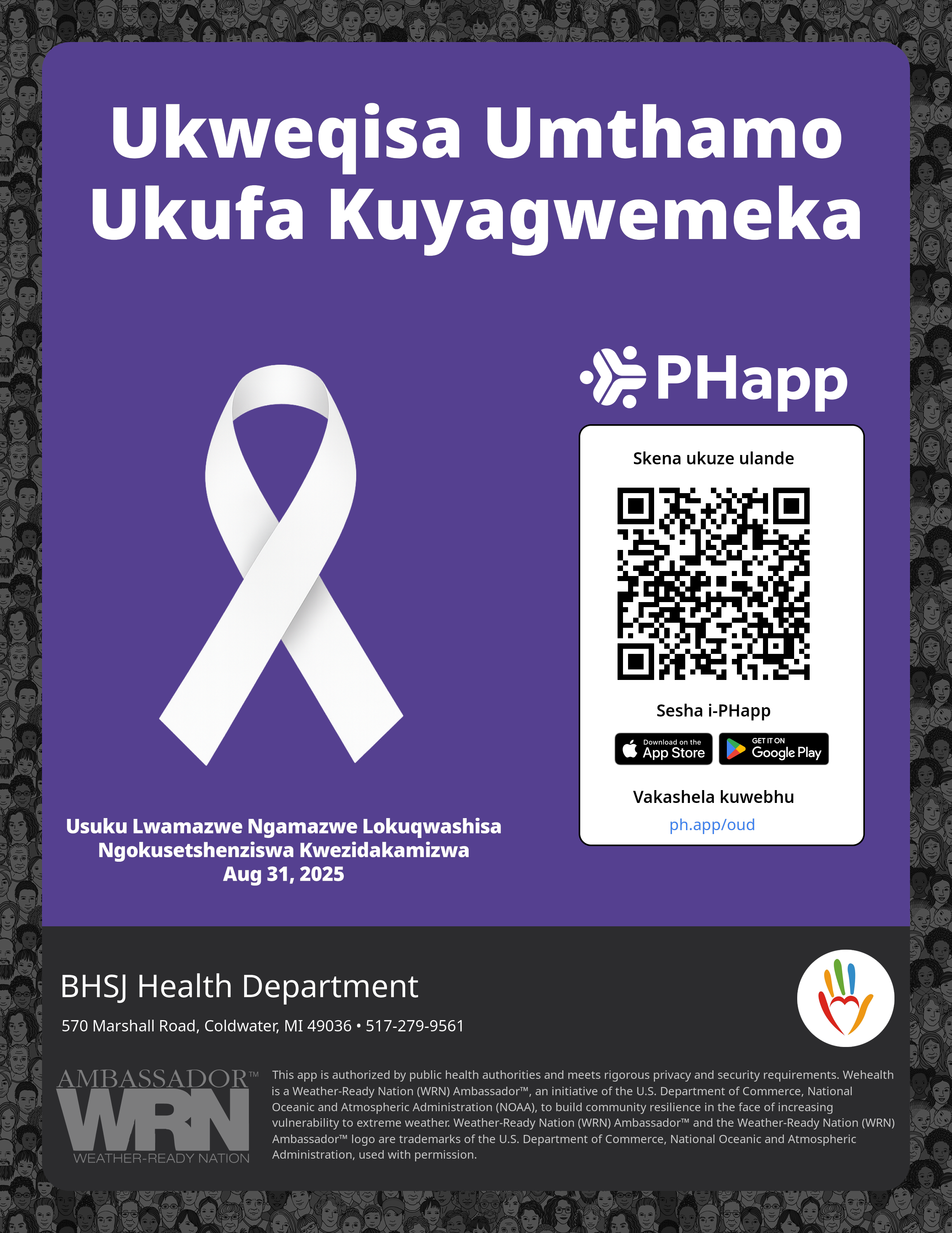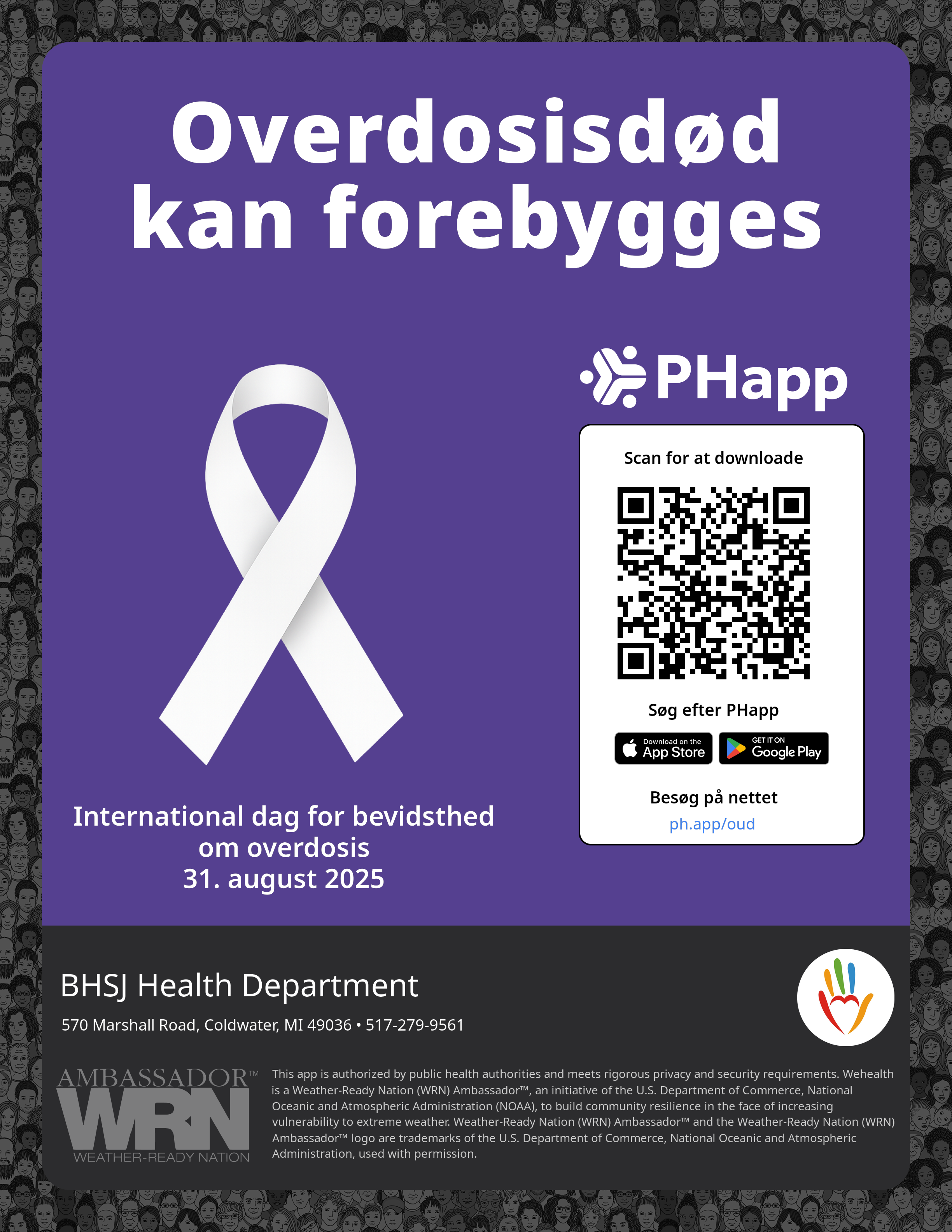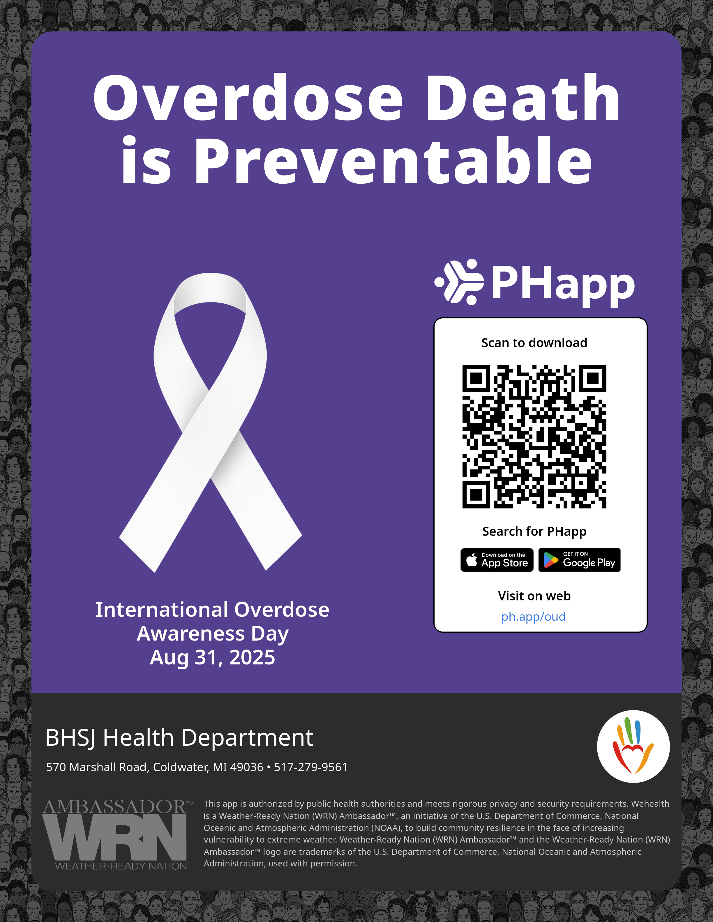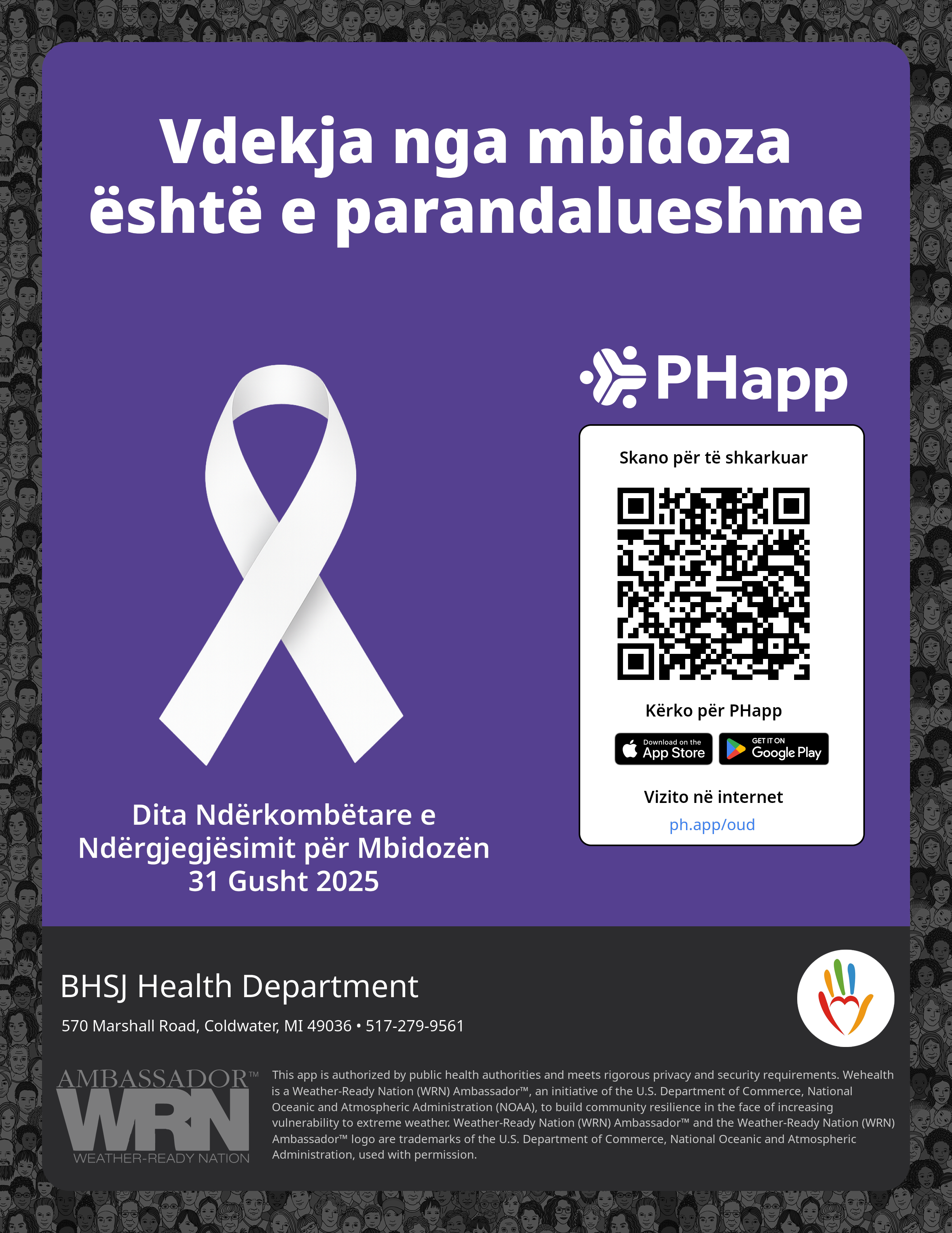 Print this flyer/poster on 8.5×11 paper. The QR code and links are personalized for BHSJ Health Department.
