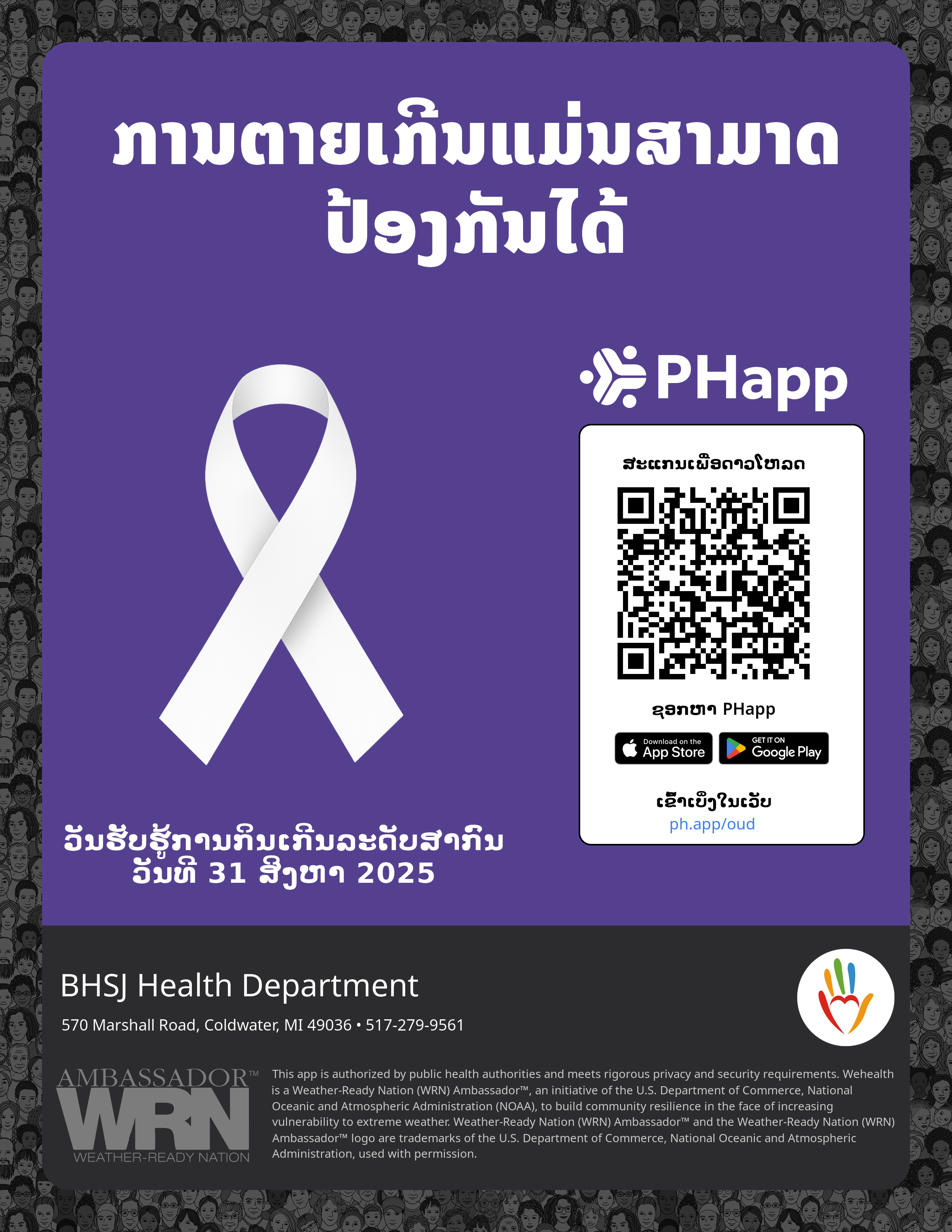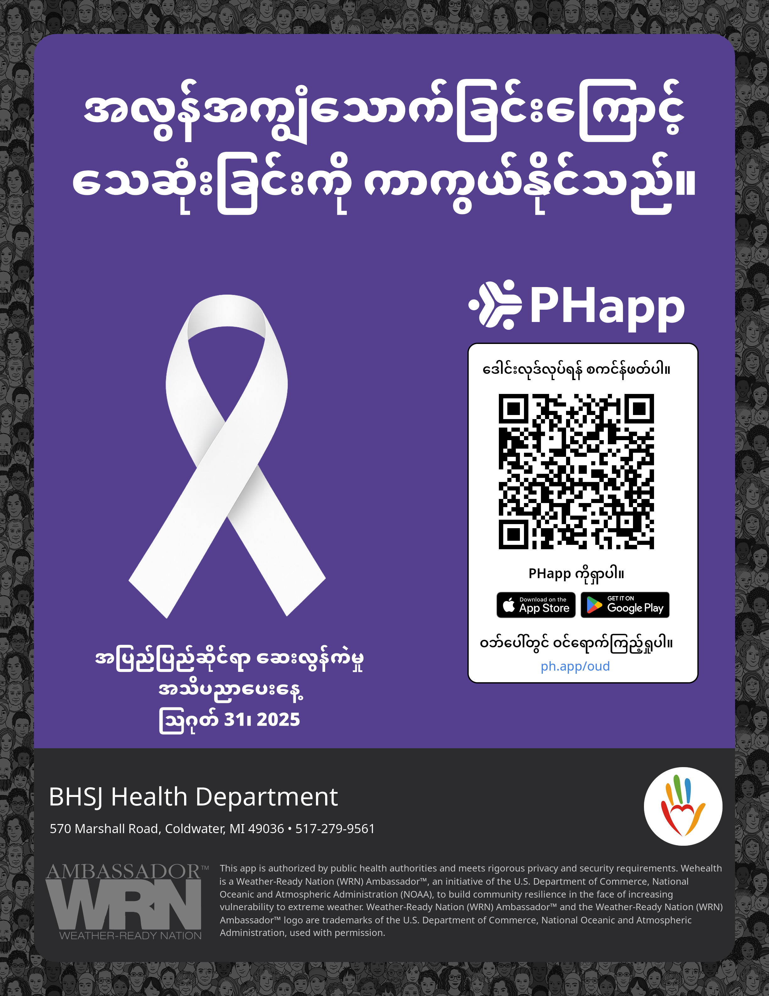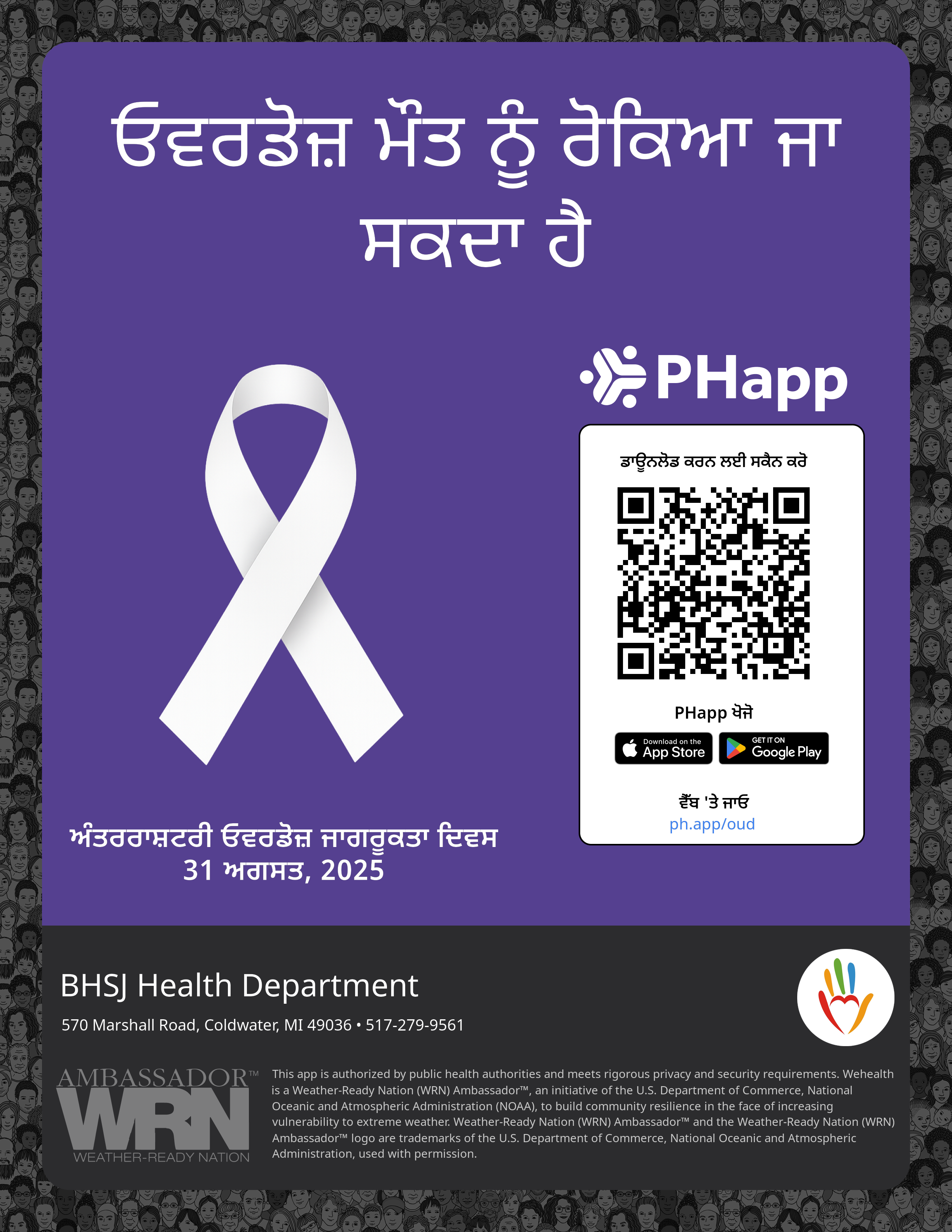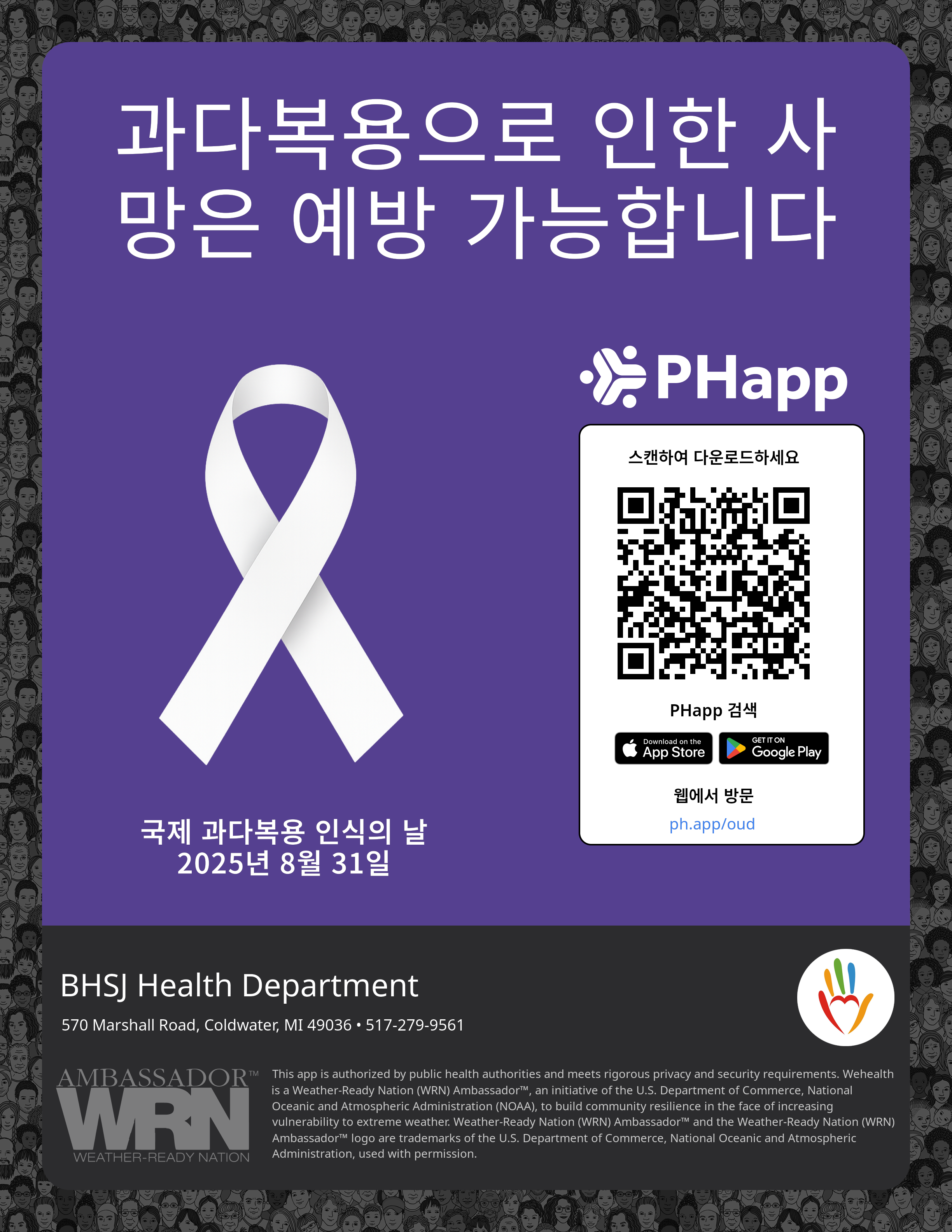 Print this flyer/poster on 8.5×11 paper. The QR code and links are personalized for BHSJ Health Department.