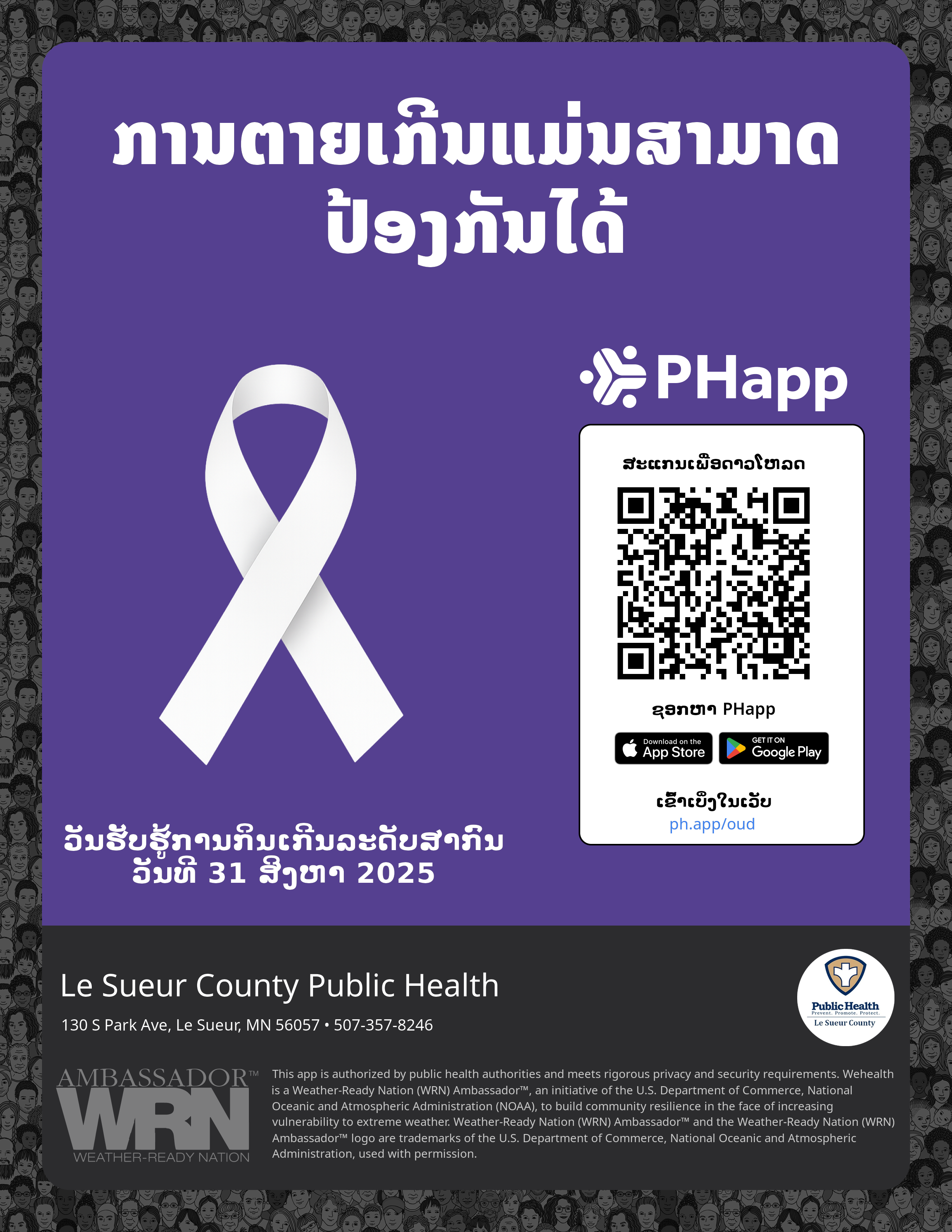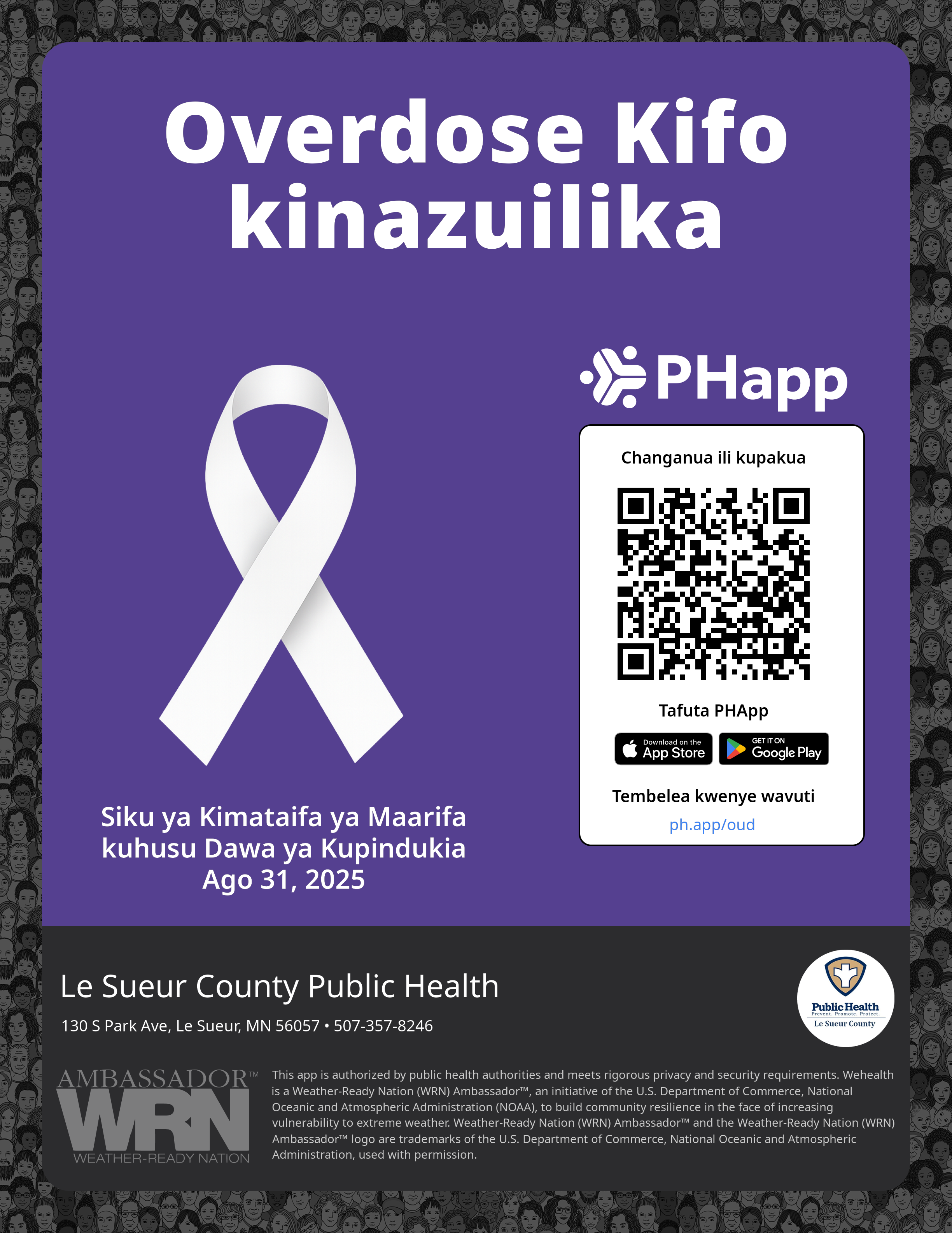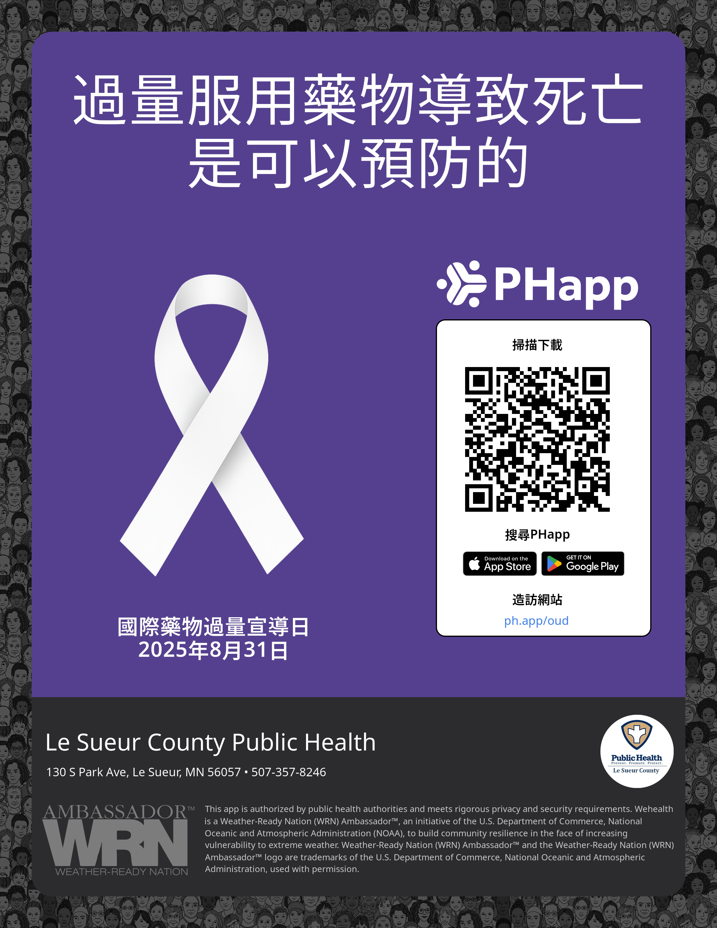 Print this flyer/poster on 8.5×11 paper. The QR code and links are personalized for Le Sueur County Public Health.