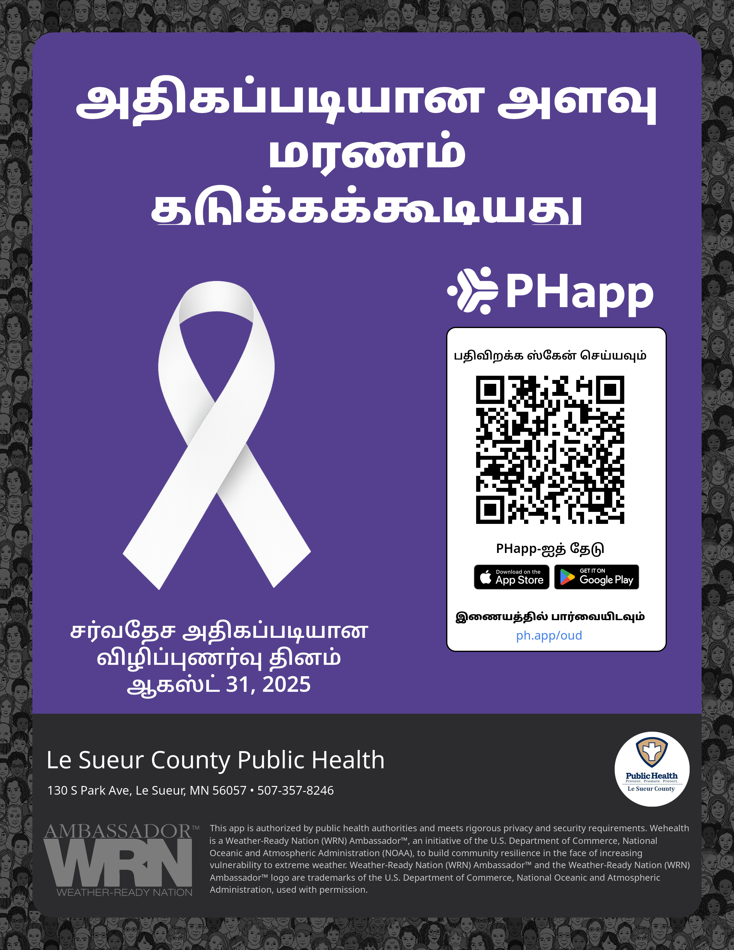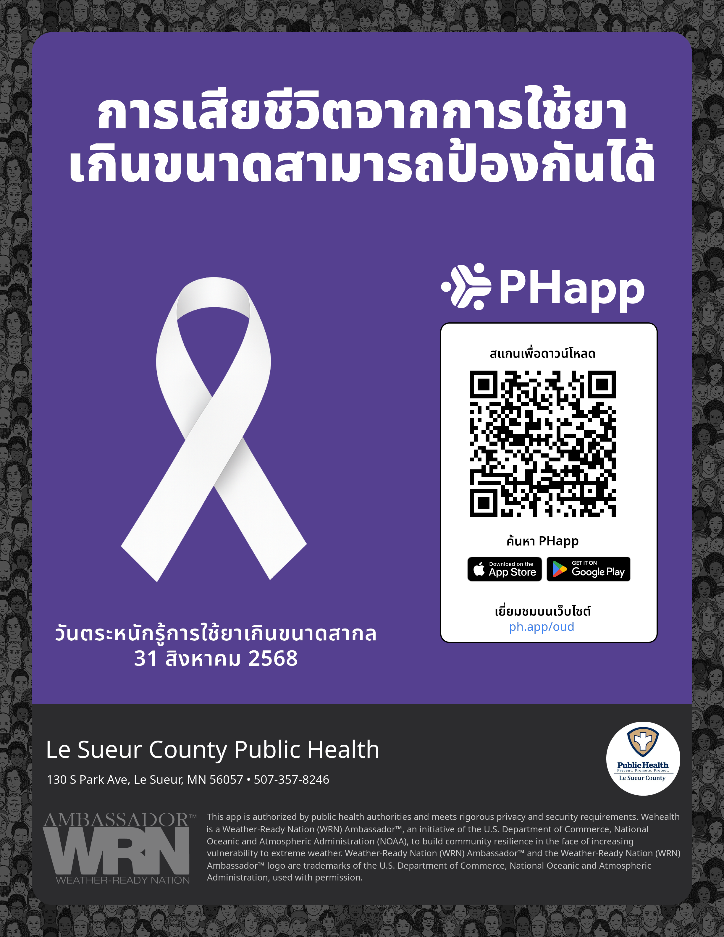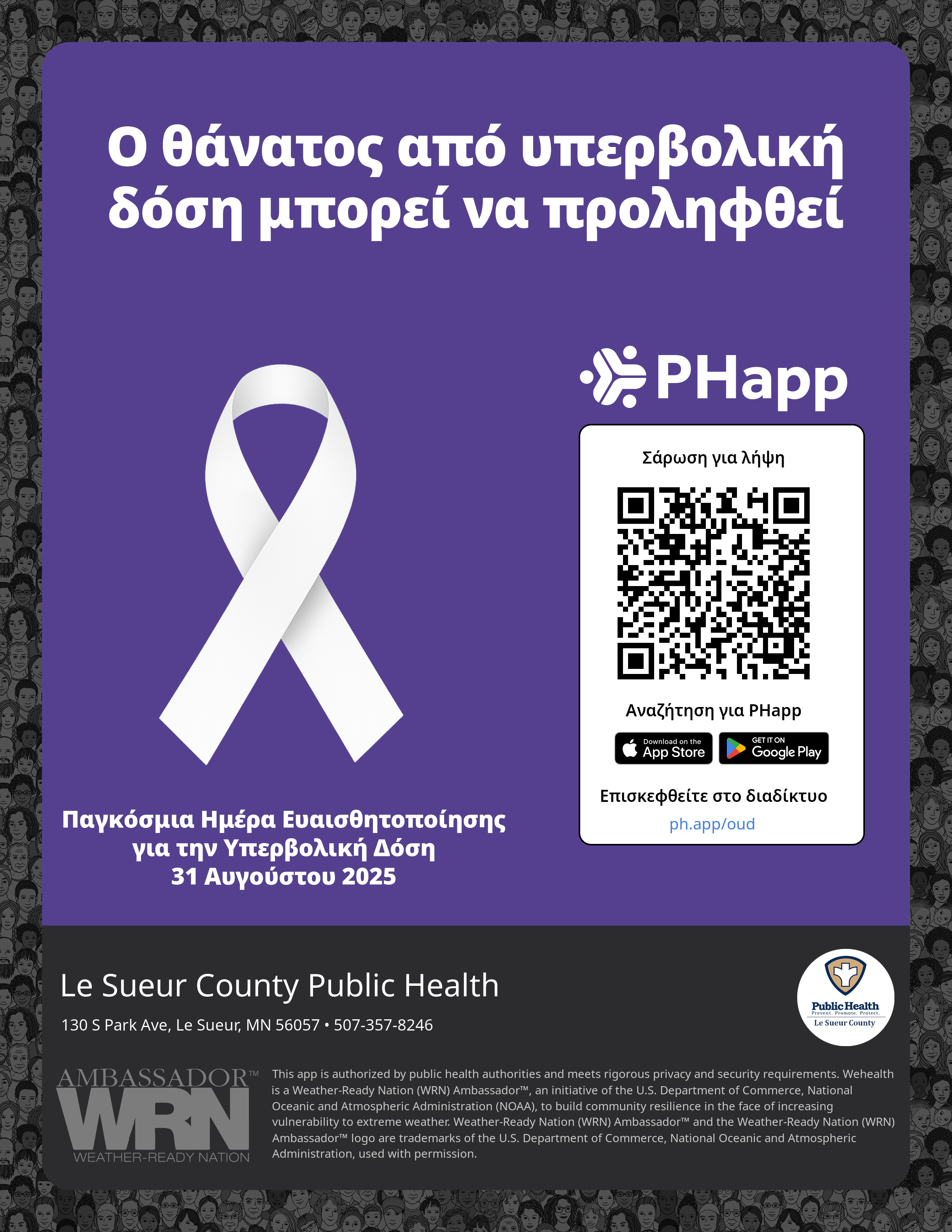 Print this flyer/poster on 8.5×11 paper. The QR code and links are personalized for Le Sueur County Public Health.