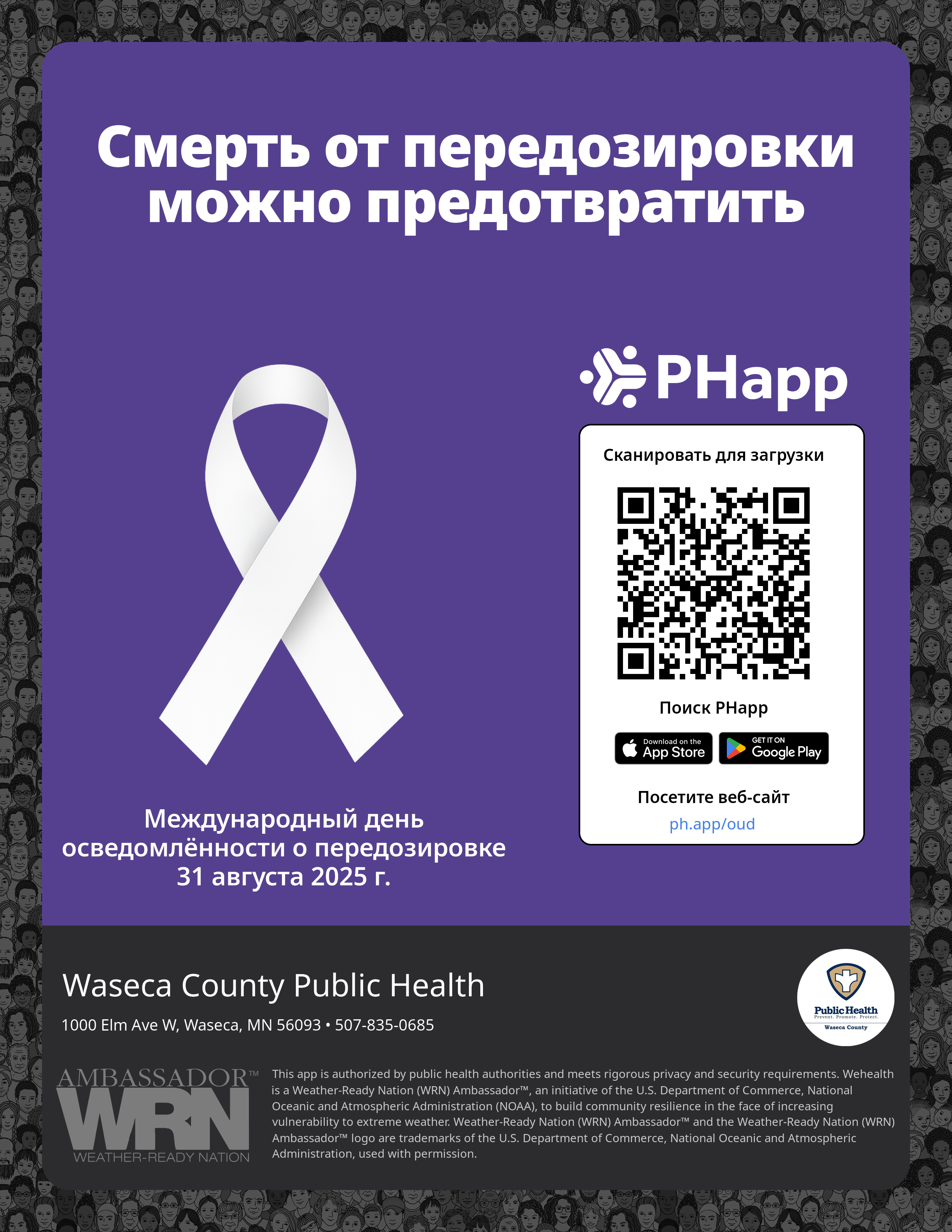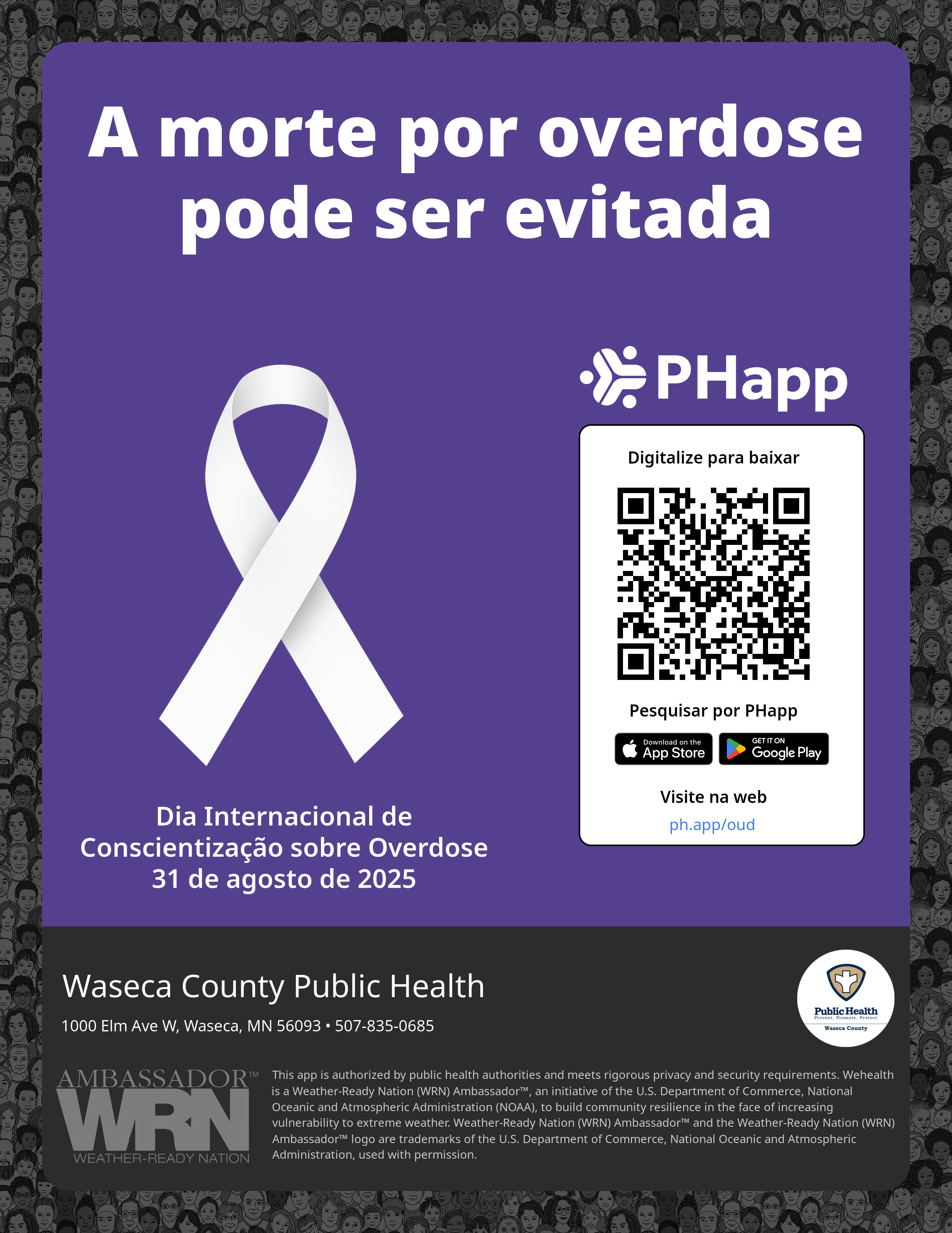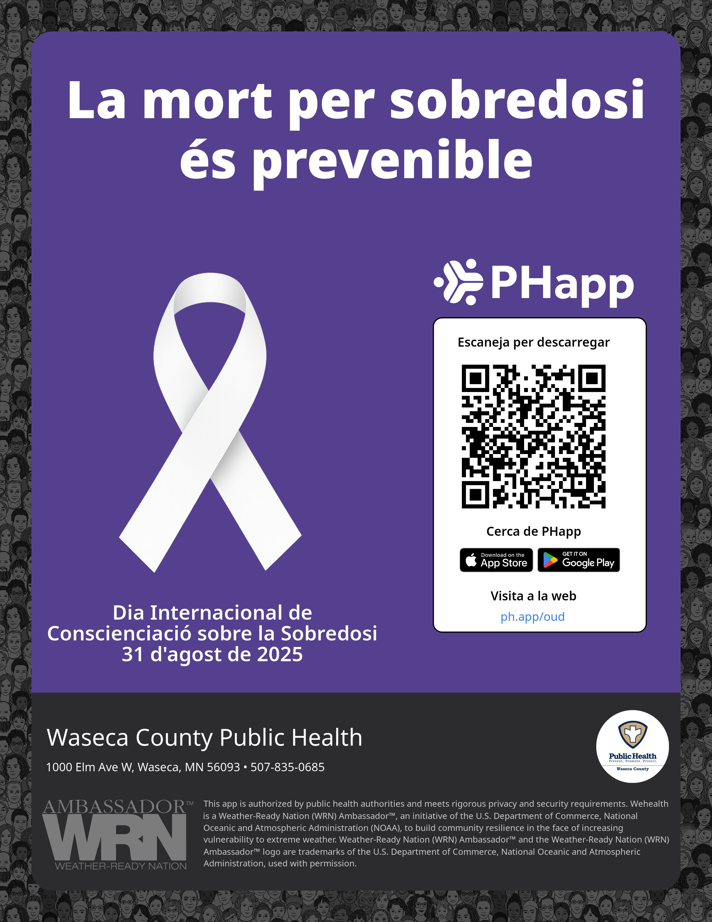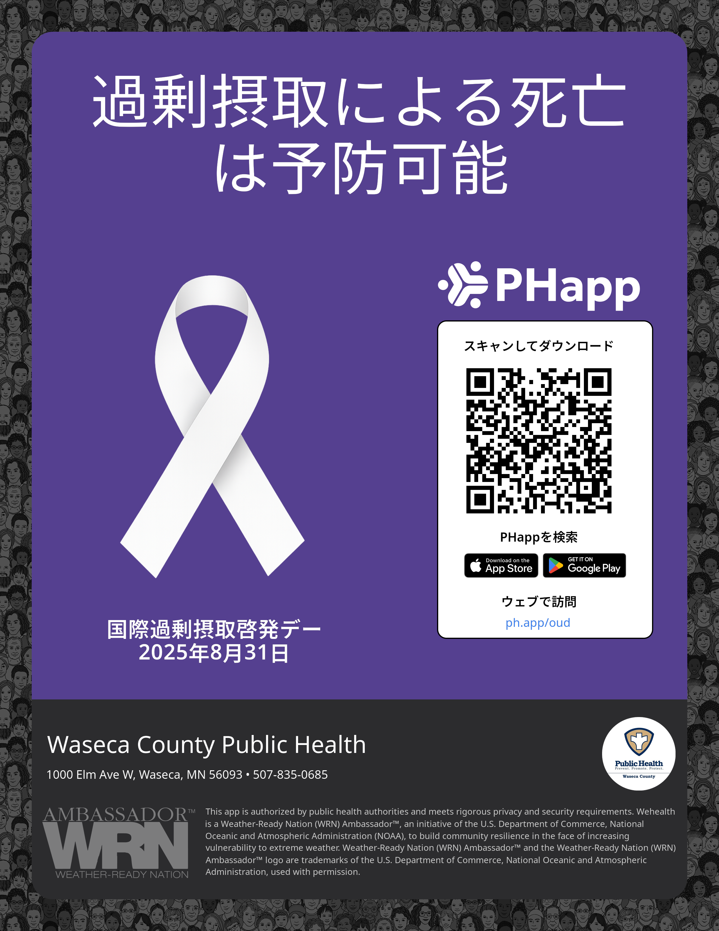 Print this flyer/poster on 8.5×11 paper. The QR code and links are personalized for Waseca County Public Health.